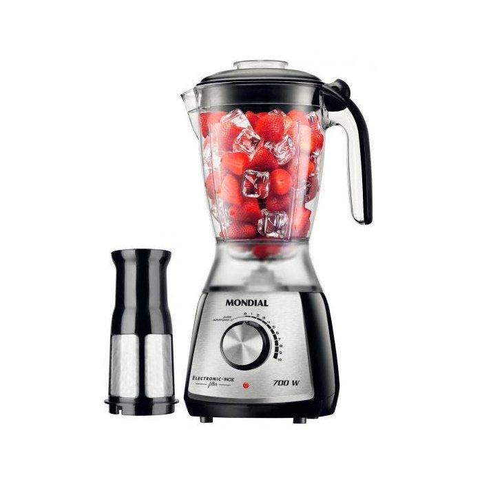 Em polipropileno e aço inox, liquidifica, mistura, pica e tritura gelo.