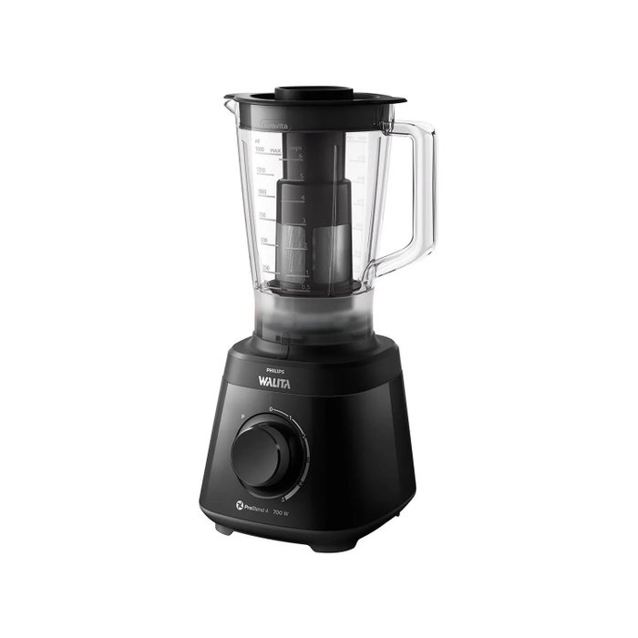 Ele tem 700W de potência, 5 velocidades + pulsar, base de plástico na cor preta e copo em material Tritan com capacidade total de 2L e bico dosador.