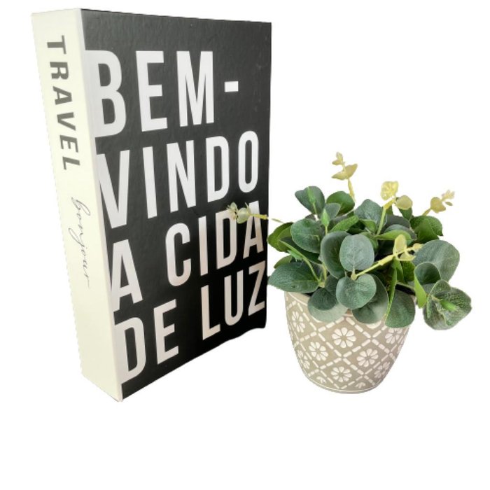 Livro de papelão decorativo estampa 'Travel Bonjour' e vaso mosaico de cimento artesanal. Uma ótima opção para compor a decoração do seu espaço com tons sóbrios e sofisticados. Nada mais encantador, original e inspirador do que utilizar livros na decoração de diversos ambientes, como salas de estar, escritórios, quartos, home office e onde mais sua imaginação permitir. Os livros decorativos são a mais nova tendência na decoração contemporânea e permitem diversas combinações e utilizações, dando um ar de sofisticação em mesas de centro, aparadores, prateleiras, escrivaninhas etc. Esse lindo livro estampa 'Travel Bonjour', irá encantar você pela riqueza de detalhes e qualidade no acabamento, junto do vaso mosaico de cimento artesanal que da um toque todo especial no ambiente. Especificações: Livro caixa abre a tampa. Cor: Preto, Branco e Cinza. Material: Papelão e Cimento. Planta artificial acompanha o vaso. Dimensões aproximadas: Altura do vaso com a planta 15cm Dimensões do cachepot: altura 8,3cm x diâmetro 9cm Dimensões do livro: altura 5cm x largura 17cm x comprimento 27cm Tags: livro, livro decorativo, livro de papelão, livro moderno, livro decoração sala, livro decoração quarto, livro decoração mesa de centro, livro decoração home office, livro decoração escritório, livro decoração prateleira, livro decoração mesa, livro decor, livro branco, livro preto, livro caixa, livro que abre, livro que organiza, livro organização, livro porta objetos, livro porta treco, livro abre a tampa, decoração, sala, quarto, casa, home office, arquitetura, decor, vaso sala, vaso quarto, vaso decor, vaso cinza, vaso de cimento, vaso, vaso decoração, vaso decorativo, vaso mosaico, vaso trabalhado, vaso de cimento trabalhado.