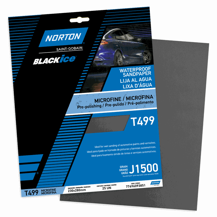 A folha de lixa Norton Black Ice T499 é uma lixa de papel com grão 1500 de Carbeto de Silício, indicada para lixamento a úmido de vernizes automotivos. Sua tecnologia proporciona um melhor acabamento e excelente durabilidade, garantindo um lixamento pré polimento mais eficaz e sem riscos na pintura.
