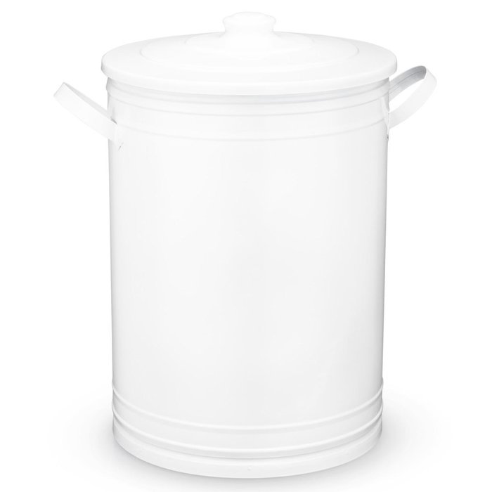 Lixeira produzida artesanalmente em aço galvanizado, com tampa de alumínio, capacidade para 30 litros e acabamento em pintura eletrostática interna e externa na cor branca.
