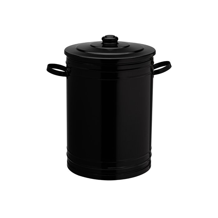 Lixeira produzida artesanalmente em aço galvanizado, com tampa de alumínio, capacidade para 30 litros e acabamento em pintura eletrostática interna e externa na cor preta.