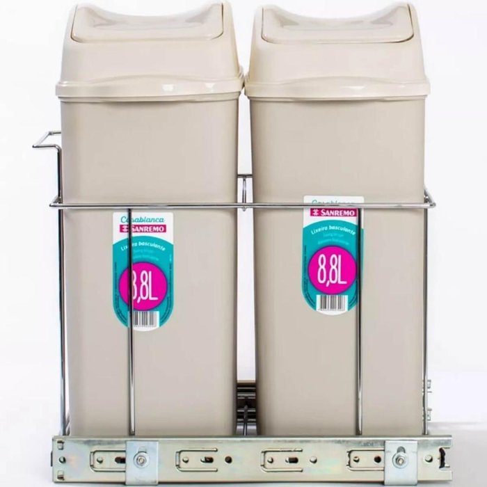 Lixeira Dupla Deslizante 8,8l de Embutir Armário Cozinha Basculante com Corrediça.<br><br>Garantia: 90 dias / Peso: 2,524 / Cor predominante: cinza claro / Referência: 7898032679201<br>Dimensões total do produto com as corrediças: 35cm (C) x 20,6cm (L) 30,3cm (A);<br>Dimensões de cada lixeira: 12,5cm (C) x 21cm (L) x 28,2cm (A);<br>Dimensões internas de cada lixeira: 13,8cm (C) x 22cm (L) x 28cm (A);<br>Tamanho modulo para instalação: 36cm (C) x 27cm (L) x 36cm (A);<br>Conteúdo: 1 lixeira dupla basculante com corrediça e presilhas de fixação;<br>Capacidade de cada lixeira: 8,8l;<br>Modelo: basculante;<br>Materiais: aço cromado e plástico.<br><br>Limpeza e cuidados: <br>- Lavar com água fria e sabão neutro utilizando esponja macia, seguido de pano seco;<br>- Não utilizar produtos químicos ou abrasivos na limpeza;<br>- Em regiões litorâneas os produtos com acabamento cromado podem sofrer oxidação prematura, ocasionada pela exposição a maresia. Neste caso, recomendamos que a limpeza seja feita semanalmente.<br><br>Detalhes do produto:<br>- As corrediças já estão montadas no aramado. Basta fixar a lixeira em seu móvel;<br>- Analise se a parte interna do seu móvel possui espaço suficiente para receber a lixeira e, assim, evitar transtornos com troca/devolução.<br><br>A lixeira dupla deslizante de 8,8 litros é um acessório inteligente, prático e funcional para embutir em armários de cozinha. Com seu design compacto e funcional, a lixeira de cozinha maximiza o espaço disponível, oferecendo uma solução conveniente para a separação de resíduos. Equipada com corrediças suaves, essa lixeira desliza facilmente para dentro e para fora do armário, proporcionando acesso rápido e sem esforço aos compartimentos de lixo. Sua capacidade de 8,8 litros em cada compartimento oferece uma boa quantidade de espaço para a coleta de lixo orgânico e recicláveis. Além disso, seu tamanho é ideal par sacolas de mercado. A instalação embutida garante que a lixeira fique discretamente integrada ao mobiliário da cozinha, mantendo-a organizada e livre de bagunça. Compartimentos separados facilitam a separação e o descarte adequado de resíduos, promovendo práticas sustentáveis e ecológicas no ambiente doméstico. Seu design durável e de alta qualidade garante resistência e longevidade, tornando-a uma adição valiosa para qualquer cozinha moderna, onde a praticidade e a organização são prioridades.