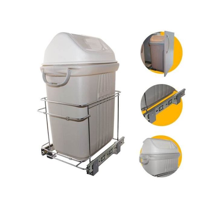 Produto utilizado em armários de cozinha nas residências ou comércios. Lixeira de embutir com trilho telescópico, podendo ser usada juntamente com a abertura da porta, pode ser instalada na base ou lateral do armário, é um produto de extrema importância para sua casa na organização e na limpeza do ambiente.