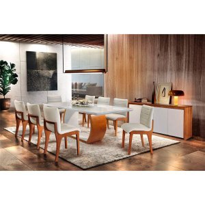Conjunto Mesa de Jantar Bella Mobillare 2,20m com 8 Cadeiras Madeira Laqueada e Linho