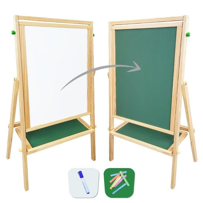 Este brinquedo educativo é bastante versátil, pois possui dupla face, e em lado a criança terá um quadro negro para brincar com giz de cores diferentes, e do outro lado um quadro branco perfeito para desenhar e escrever com caneta própria para quadro branco. Além disso possui uma bandeja na parte inferir, possibilitando que as crianças guardem seus materiais.