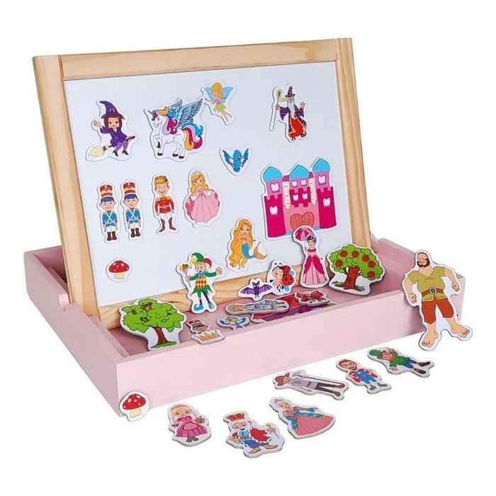 A lousa magnética mundo encantado, possui dois lados sendo um para imantar as peças e o outro para ser usado como quadro negro. Além de desenhar no quadro negro a criança também poderá criar vários cenários na parte branca da lousa, e usar o lado verde da lousa para escrever e desenhar com giz.