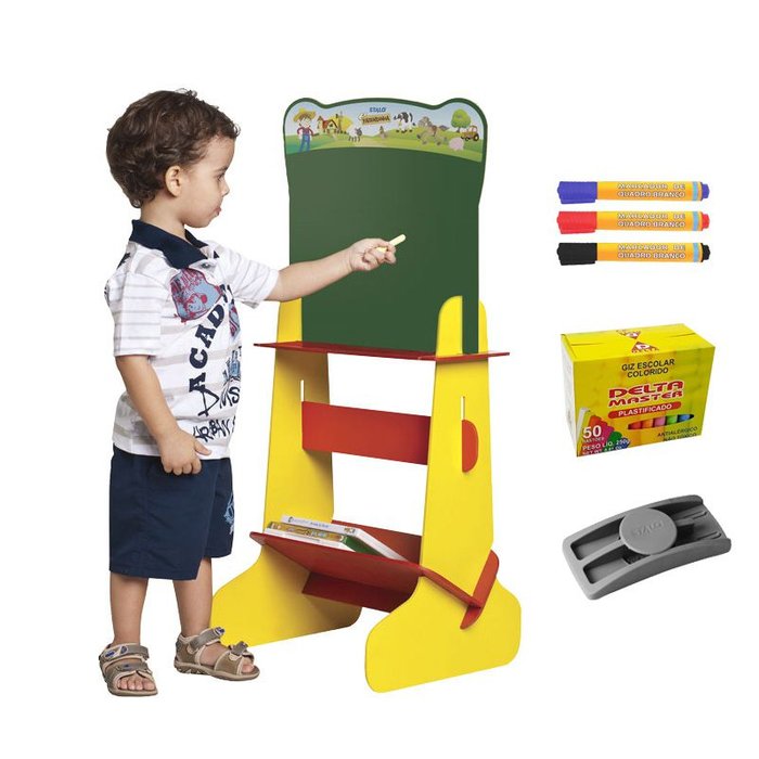 Lousinha Dupla Infantil Com Quadro Branco e Quadro Verde (Dupla Face) e Com Cavalete - Tema Fazendinha Stalo + 3 Marcador P/ Qdo Bco Sortidos + 1 Cx Giz Colorido C/ 50 + Apagador Plástico STALO