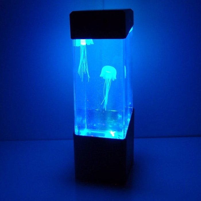 Luminária que imita um pequeno tanque com águas vivas. As cores remetem a um aquário e os peixinhos ficam "nadando" dentro do produto. Altura: 23 cm Largura: 8 cm Profund: 8 cm Peso: 0.400 Kg Energia: 3 AA Material: Plástico *Não acompanha fonte de tomada.