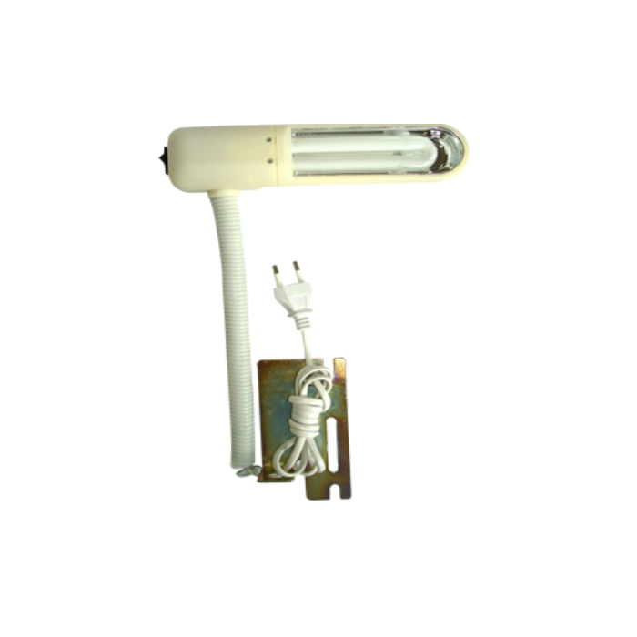 Luminária com lâmpada fluorescente, pode ser fixada com parafusos direto na base da máquina de costura, possui haste flexível para direcionamento da iluminação, pode ser utilizada em máquinas de costura, bordado e demais equipamentos e utilizações.