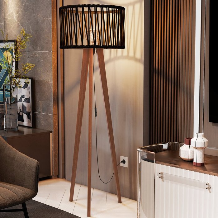 Luminária de Chão Pé em Madeira e Cúpula de Corda Náutica Preto
