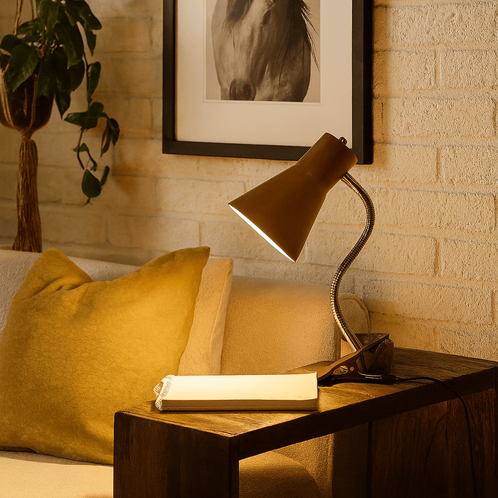 A Luminária Amélia está equipada com soquete G10, ideal para lâmpadas LED (não incluídas), o que garante uma iluminação eficiente e econômica. A cúpula articulável com rotação de 180º oferece liberdade total para ajustar a direção da luz conforme suas necessidades, seja para leitura, trabalho ou para destacar um elemento decorativo. Com uma presilha resistente, ela é fácil de fixar em superfícies como mesas, prateleiras ou superfícies, oferecendo flexibilidade e praticidade na iluminação de qualquer ambiente.
