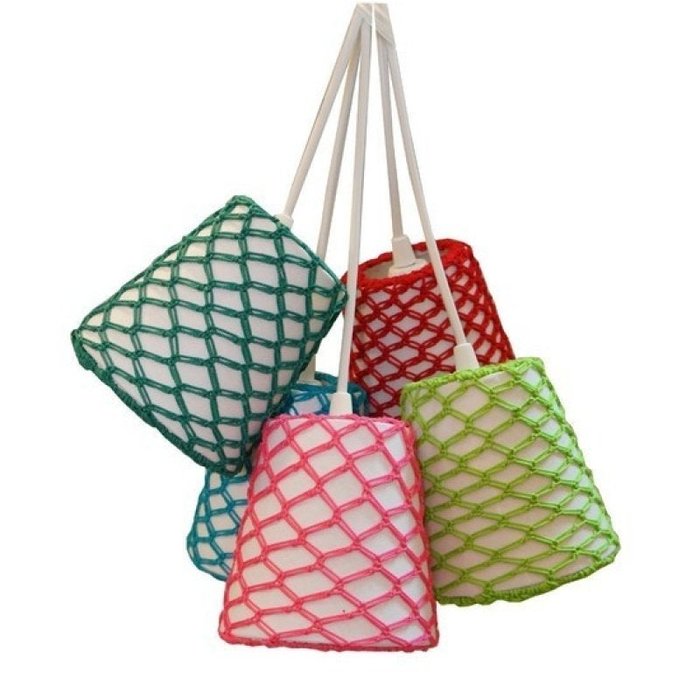 Luminária Pendente Crochê 5 Cúpulas azul, pink, verde claro, verde escuro e vermelha