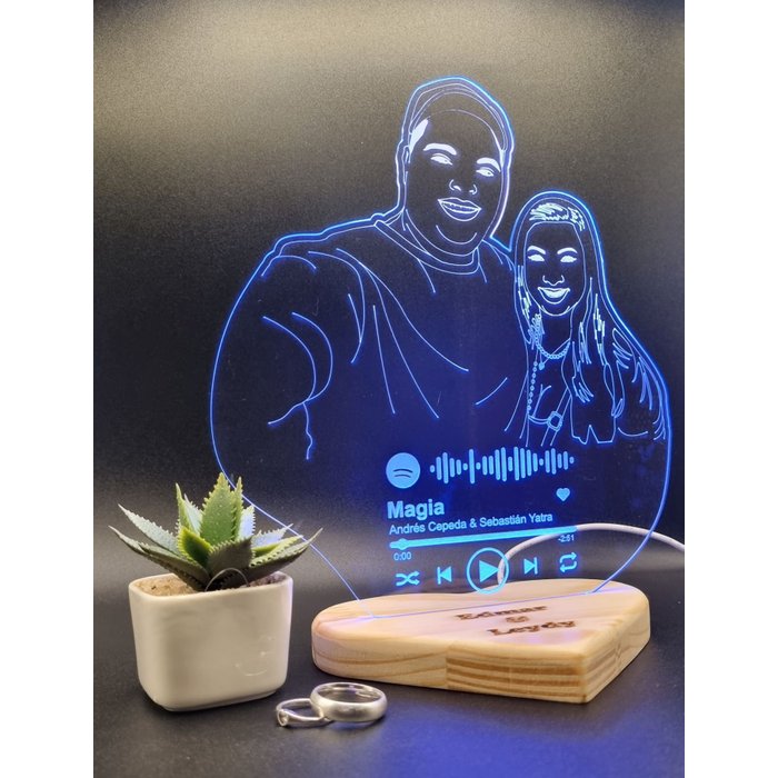 Descrição: Adicione um toque à sua decoração com a Luminária Spotify, que apresenta uma foto de sua escolha.. Equipada com uma iluminação LED 3D e montada em uma base sólida de pinus, esta peça é tanto funcional quanto esteticamente agradável. (Você pode escolher base de madeira ou base plástica preta ou branca.)