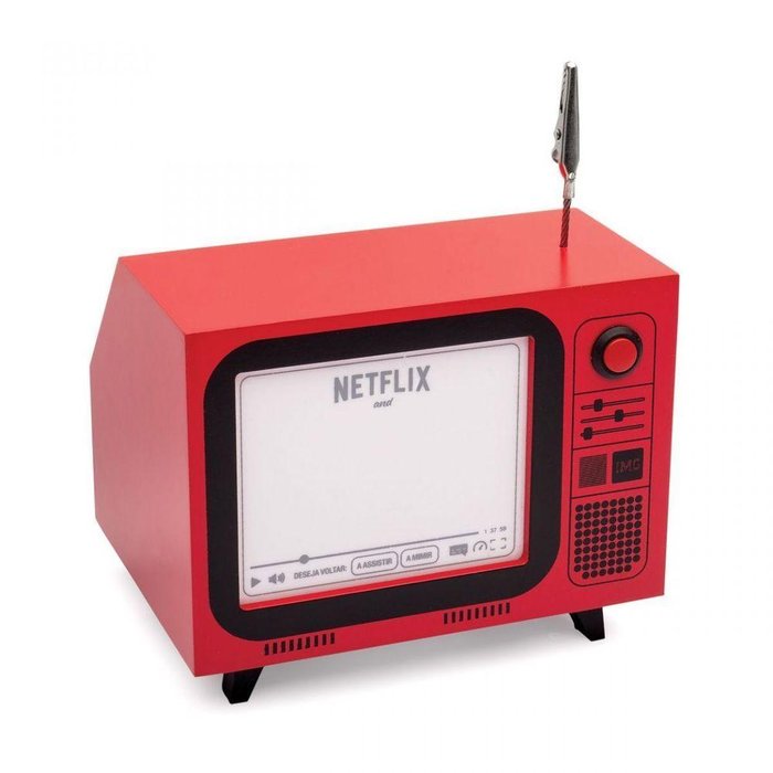 Ela é 3 em 1: luminária com projeção, lousa para anotações e um lindo item pra sua decoração da sala ou do quarto, graças ao seu design único de uma TV com a arte semelhante à da tela principal da Netflix.