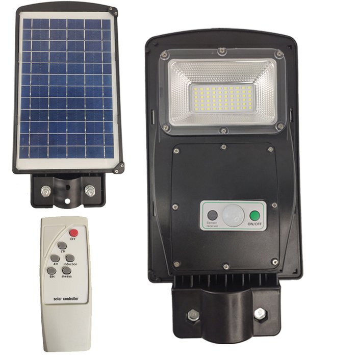 Luminária Solar Poste Led 60w Sensor Controle Quintal Jardim Rua Com a Luminária Solar você economiza a Energia Elétrica da sua casa ou do seu estabelecimento. Usando apenas a Energia Solar Gera uma energia Capaz de iluminar 70 metros quadrados em um ângulo de 120 graus. Utilize em áreas externas como: Garagens, Fazendas, Lojas, Hotéis, Estacionamentos e Shoppings Center's, Reduza seus custos com conta de Luz. Usando uma Energia Limpa e Eficiente. Possui Instalação Fácil, sem fios Configuração simples feita com o uso de controle remoto. ATENÇÃO: Esse produto não acompanha o poste de fixação Caracterísicas Material: ABS Potência 60w Cor da Luz: Branco Frio Temperatura da cor: 6500k Sensor de proximidade Controle remoto com funcionamento até 15 metros 60 Leds Controle inteligente de luz Fotovoltaico Longa duração de até 10 horas. Resistente a chuva (IP65) Funções do controle: On/off Timing 2/4/6 horas Inducion - Luz acende com 100% e, ao sair do alcance do sensor a luz cai para 20% por 15segundos Always - Luz sempre acesa até acabar a bateria. Dimensões do produto: Comprimento: 36cm Largura: 18,5cm Altura: 6cm Conteudo da Embalagem: 1x Luminaria Poste Solar 1x Controle 2x Pilhas AAA 3 meses de garantia contra defeito de fabricação modelo: LS60W