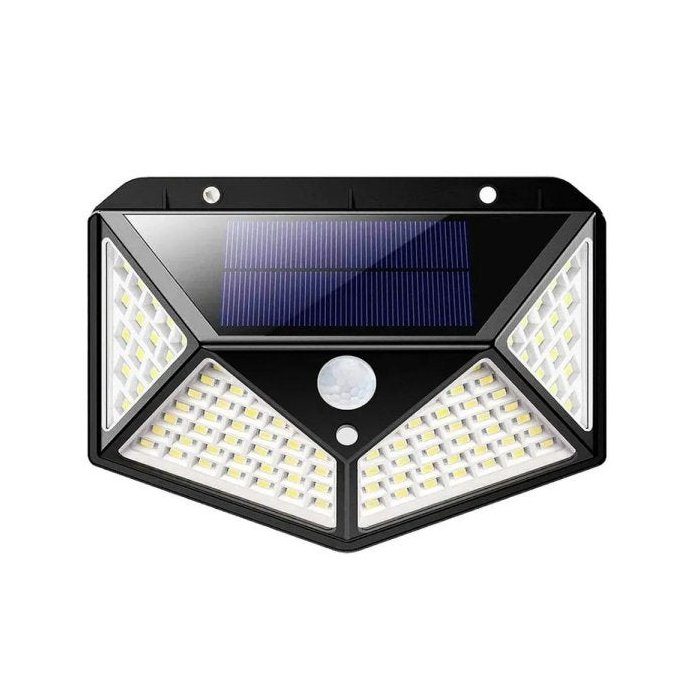 Luminária solar com detector de movimento e acendimento automático acionada pela intensidade de luz ambiente. Com autonomia de até 12 horas e grande intensidade de luz com 100 leds.