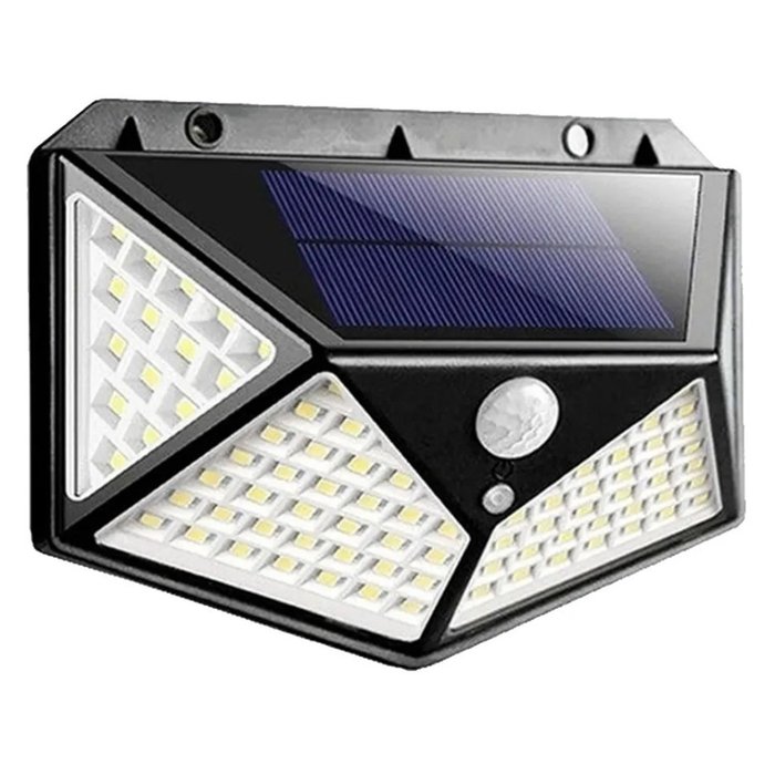 Luminária solar com detector de movimento e acendimento automático acionada pela intensidade de luz ambiente. Com autonomia de até 12 horas e grande intensidade de luz com 100 leds.