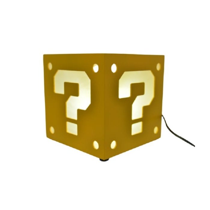 Luminária de MDF, para mesa de centro, rack ou cabeceira de cama ou para decoração do ambiente.Modelo: Super MárioCor: Amarelo ouro.Marca: Zero GeekMedidas: 20x20cm.Lâmpada de Iluminação com 3,5 watts de potência, Bivolt.