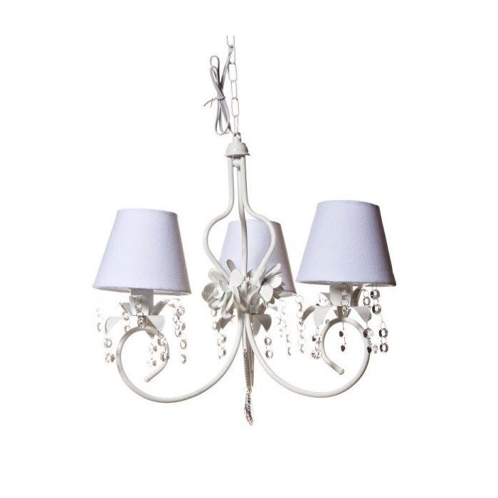 Lustre com 3 lâmpadas em alumínio com pintura eletrostática branca, cúpulas em acetato forrado com tecido, 3 flores rosa de metal com folhas verdes no centro e decoração com cristais.