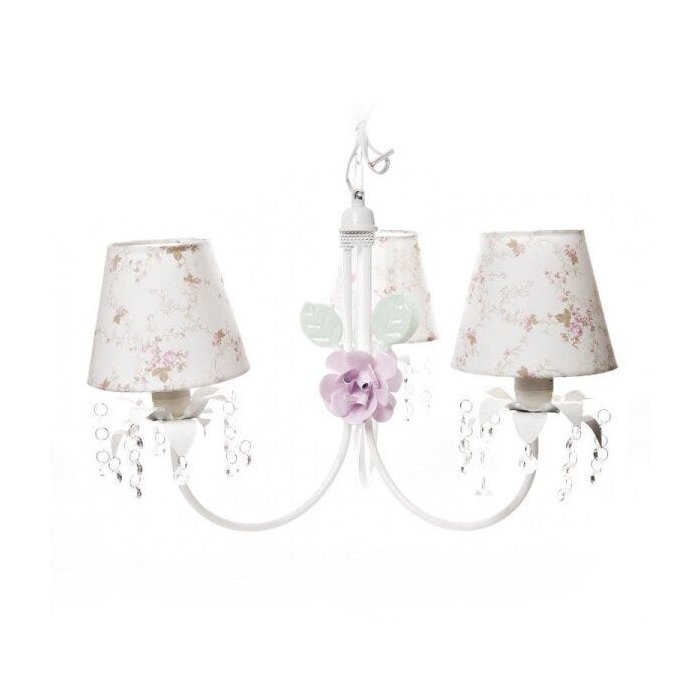 Lustre com 3 lâmpadas em alumínio com pintura eletrostática branca, 2 flores rosa com folhas verdes, decoração com cristais e cúpulas em acetato forrado com tecido.</p><p><b>Lâmpadas Suportadas:</b>