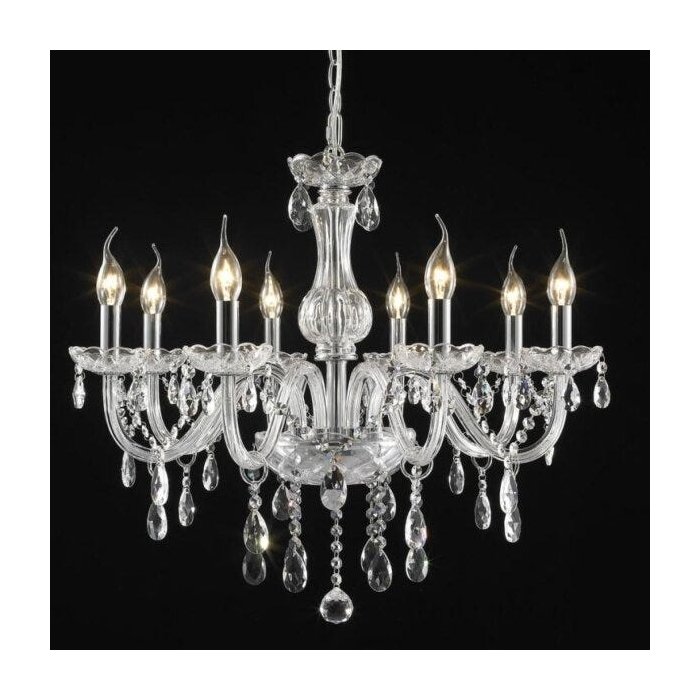 Lustre candelabro com cristais e 8 braços. Corpo e braços fabricado em vidro e pingentes em cristais K9 para 08 lâmpadas base E14 (lâmpada vela), pode ser utilizado lâmpada LED. Corrente regulável e coberta com tecido de veludo.