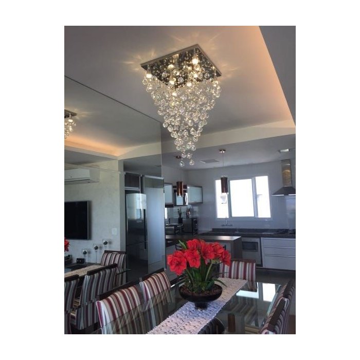 Especificações técnicasCor da Base: prateada, cristais transparentesModelo : chuva de cristaisGarantia : 12 meses Material : Aço inox espelhado / cristal LegitimosAcabamento: Aço inox polido ( espelhado) Quantidade de pêndulos ( 120 ) Esferas ( 30MM ). 120unidadesCastanhas 14MM em cristais, esferas fixadas com cabos de aço.Dimensões : Base ( 50x50 ) de sobrepor com a parte lateral com 2cm de inox.Altura: ( 80cm ) Instalação : laje ou gesso drywall Forro PVC ou madeiratrava central de fácil fixação.Soquetes em porcelana ( 8 ) com capinhas cromadas.Lampadas LED (Lâmpada inclusas)