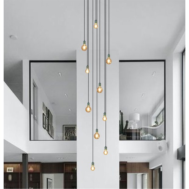 - O lustre é ligado em energia elétrica através de um cabo do tipo PP com ajuste de altura, ideal para pé direto entre 4 e 8 metros de altura.