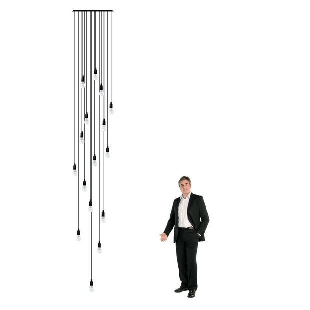 Elegante e sofisticado, esse é o Lustre para sala Pratic 16 lâmpadas Preto pé direito alto. Ideal para pé direito a partir de 4,3 metros, podendo ser instalado até 8 metros de altura.