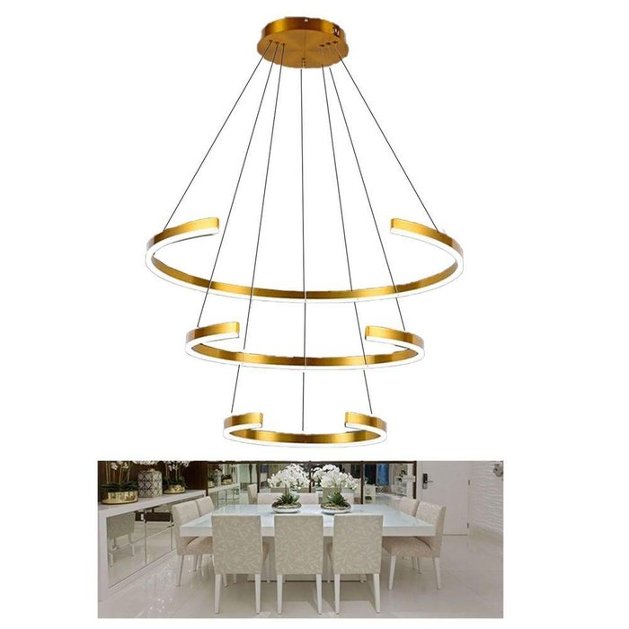 Lustre Pendente 3 Aneis Arco Perfil Luminaria Ajustavel 94w Dourado Sala de Estar Casa