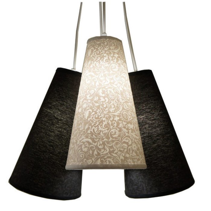 Lustre pendente com 4 cúpulas revestidas com tecido arabescos em branco e preto. Decoração exclusiva para sua casa 2 cúpulas tecido arabesco preto 2 cúpulas tecido arabesco branco Dimensões de cada cúpula: Altura: 30 cm Largura inferior: 18 cm Largura superior: 8 cm O comprimento total da luminária é ajustável no momento da instalação. Cada cabo tem 90 cm de comprimento. Usar lâmpadas fluorescentes ou led (incandescente até 25w). Canopla e cabos na cor branca. Bivolt