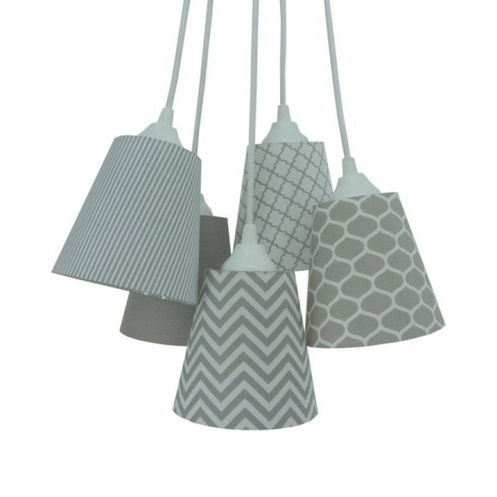 Lustre pendente com 5 cúpulas revestidas com tecidos, sendo 1 cúpula colmeia cinza, 1 cúpula listrada cinza e branca, 1 cúpula chevron cinza e branca, 1 cúpula cinza e 1 cúpula arabesco cinza. Material transparente e tecidos geométricos em cinza e branco para uma iluminação exclusiva. Dimensões de cada cúpula: Altura: 13 cm Diâmetro Superior: 8 cm Diâmetro Inferior: 13 cm O comprimento total da luminária é ajustável no momento da instalação. Cada cabo tem 90 cm de comprimento. Usar lâmpadas fluorescentes ou led (incandescente até 25w). Canopla e cabos na cor branca. Bivolt.