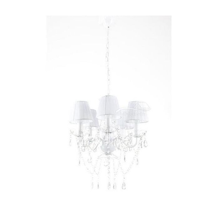 Lustre Pendente 110/220V tipo candelabro para 5 lâmpadas E14 (máx. 40W), moldura pintada na cor branca, decorado com pingentes translúcidos em acrílico e cúpulas sobre as lâmpadas em tecido na cor branca. Seu design contemporâneo, ideal para ambientes residenciais, traz uma função decorativa e proporciona uma iluminação agradável com as sombras geradas pelas cúpulas.
