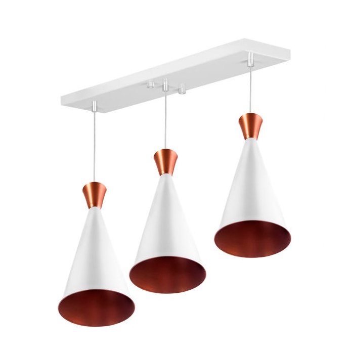 Lustre Pendente Funil Triplo Base Retangular Branco/Cobre
