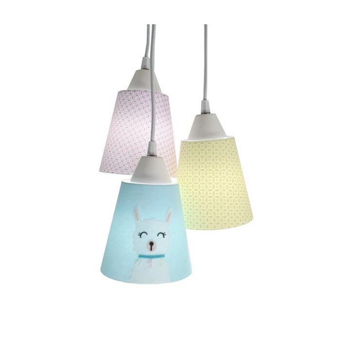 Lustre pendente com 3 cúpulas revestidas em tecido tricoline , sendo 1 cúpula arabescos amarelo, 1 cúpula arabescos rosa e 1 cúpula verde claro com aplique de lhama.Dimensão de cada cúpula: Altura: 13 cm Diâmetro inferior: 13 cm Diâmetro superior: 8 cm O comprimento total da luminária é ajustável no momento da instalação. Cada cabo tem 90 cm de comprimento. Usar lâmpadas fluorescentes ou led até 25 w. Soquete E-27 Canopla de teto e fios brancos. Bivolt.