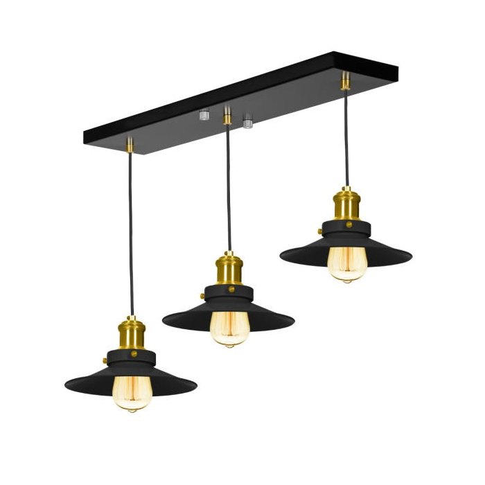 Lustre Pendente Nordic Triplo Base Retangular Preto/Dourado
