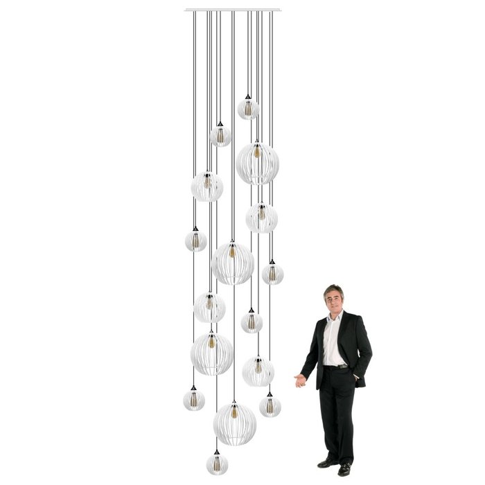 – Este produto é composto por 4 pendentes Ball de altura 37 cm e diâmetro 42cm, 4 pendentes Mini Ball altura 26 cm e diâmetro 28 cm e mais 8 pendentes Micro Ball com altura 15 cm e 18 cm de diâmetro.