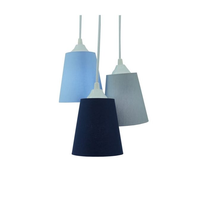 Lustre pendente com 3 cúpulas revestidas com tecidos nas cores azul marinho, cinza e branco.