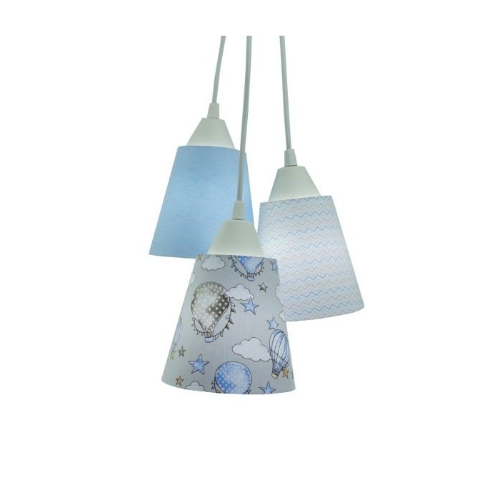 Lustre pendente com 3 cúpulas revestidas com tecidos em em formato de cacho. 1 cúpula em tecido cinza com balões azuis 1 cúpula em tecido mini chevron azul e bege1 cúpula em tecido azul claroPerfeito para iluminar e decorar o quartinho do seu bebê. Dimensão de cada cúpula: Altura: 13 cm Diâmetro inferior: 13 cm Diâmetro superior: 8 cm O comprimento total da luminária é ajustável no momento da instalação. Cada cabo tem 90 cm de comprimento. Usar lâmpadas fluorescentes ou led até 25 w. Soquete E-27 Canopla de teto e fios brancos. Bivolt.