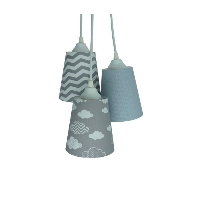 Lustre pendente com 3 cúpulas revestidas com tecido em formato de cacho. 1 cúpula em tecido estampa tricô cinza1 cúpula em tecido nuvens cinza e branco1 cúpula em tecido chevron cinza e brancoPerfeito para iluminar e decorar o quartinho do seu bebê. Dimensão de cada cúpula: Altura: 13 cm Diâmetro inferior: 13 cm Diâmetro superior: 8 cm O comprimento total da luminária é ajustável no momento da instalação. Cada cabo tem 90 cm de comprimento. Usar lâmpadas fluorescentes ou led até 25 w. Soquete E-27 Canopla de teto e fios brancos. Bivolt.