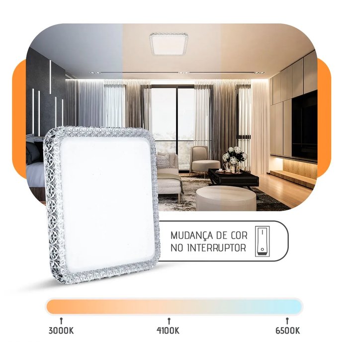 Mudanca de cor atraves do interruptor ligando e desligando para alterar para branco quente, branco neutro e branco frio.