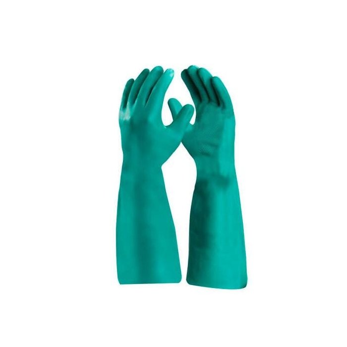 A luva de segurança é produzida em borracha nitrílica, espessura de 0,55 mm, palma antiderrapante, comprimento de 46 cm e sem revestimento interno (acabamento clorinado), que aumenta a resistência química, evita a contaminação do produto manipulado, protege as mãos do usuário, permite a higienização e a secagem das luvas em qualquer momento e possui excelente desempenho em trabalhos químicos.