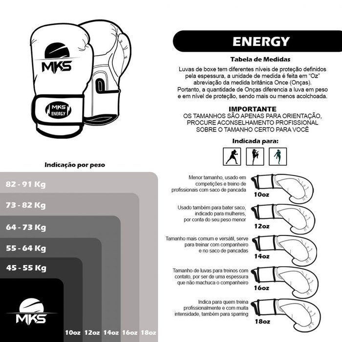 A luva de boxe MKS Energy II atende aos atletas amadores e profissionais que querem o máximo de performance para treinar na academia e até competir no mais alto nível dos esportes de combate. Indicada para boxe, muay thai, kickboxing, savate e sanda. batizamos essa luva de boxe como Energy II e em cores vibrantes para homenagear todos que dão toda sua energia nos treinos. só na MKS você tem essas cores exclusivas. Características técnicas: luva de boxe MKS Energy II: - Material de revestimento: P.U. (Poliuretano, resistente e elástico) - Espuma extra de gel injetada - Punho estendido, em formato “V”, para proteção de golpes do muay thai - Ventilação básica na palma das mãos - Fita dupla face aderente para ajuste e regulagem - Elástico entre dedão e demais dedos