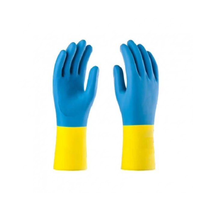- Luva de segurança confeccionada em látex/neoprene, forrada com flocos de algodão, superfície externa antiderrapante (tipo colmeia) na palma e dedos.