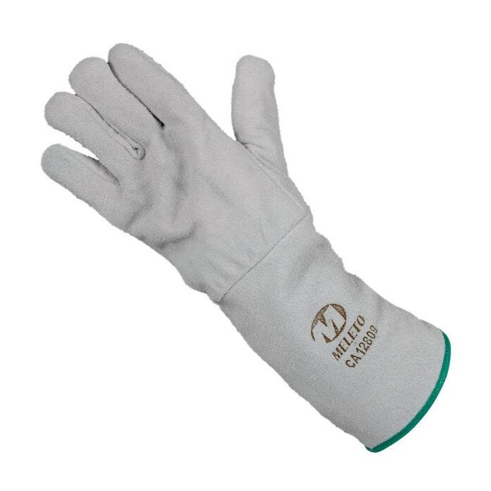 A LUVA DE RASPA TERMICA PUNHO 20 CM | MELETO é utilizada na proteção das mãos do usuário contra agentes térmicos (pequenas chamas, calor de contato, convectivo, radiante e metais fundidos. Luva de segurança confeccionada em raspa, revestida internamente com tecido do tipo feltro.