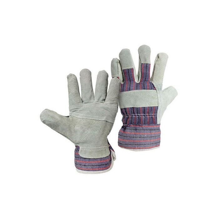 Luva de segurança mista, confeccionada em raspa e em lona. Raspa na face palmar, nos dedos, ponta dos dedos e uma faixa central de reforço no dorso e na palma. Dorso e punho em lona com elástico embutido.