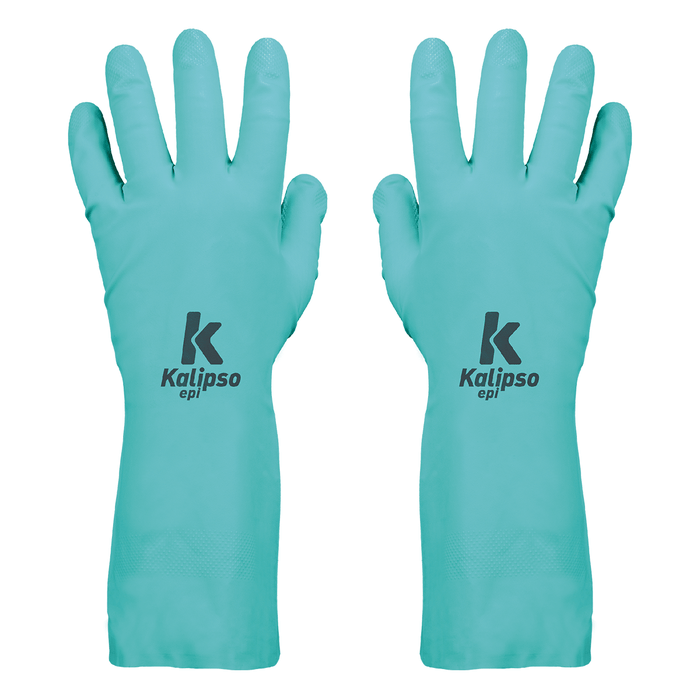 A luva de segurança Nitrili-ka 05 Verde da Kalipso é confeccionada 100% em látex nitrílico, sem forro interno, acabamento clorinado, palma antiderrapante. Acabamento do punho reto.
