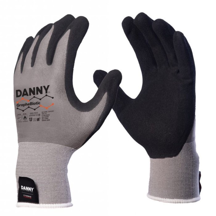 A luva GrapheBiotic da Danny traz tato e versatilidade para processos de montagem, usado em atividades que exigem sensibilidade tátil e aderência. Flexibilidade e leveza, reduz a fadiga, resiste a tração e impermeabilidade, lavável e reutilizável, proteção contra abrasão, antibacteriana e UV. Antiestática.