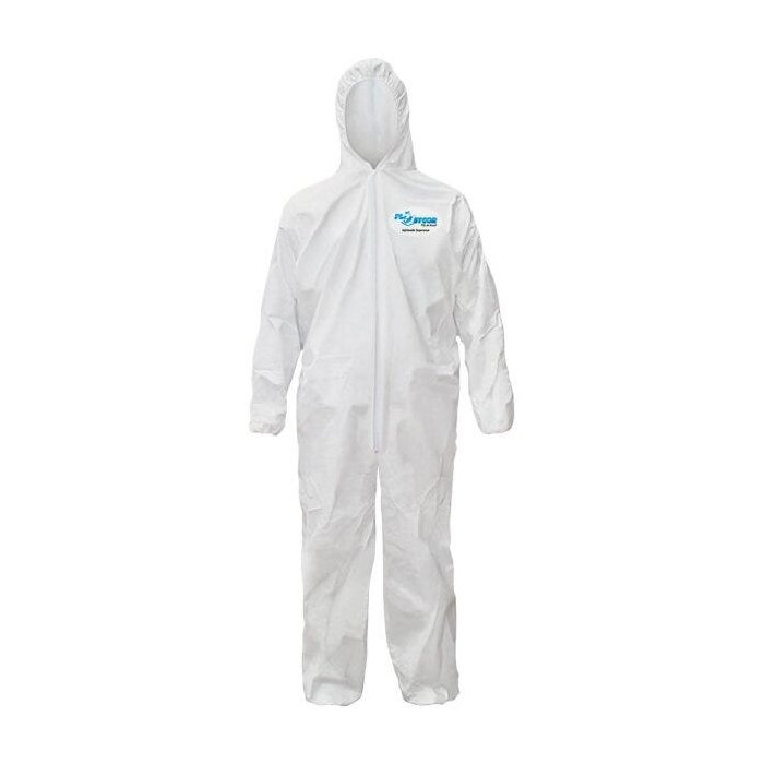 Macacão de PVC forrado confeccionado em material impermeável, oferecendo proteção contra produtos químicos.