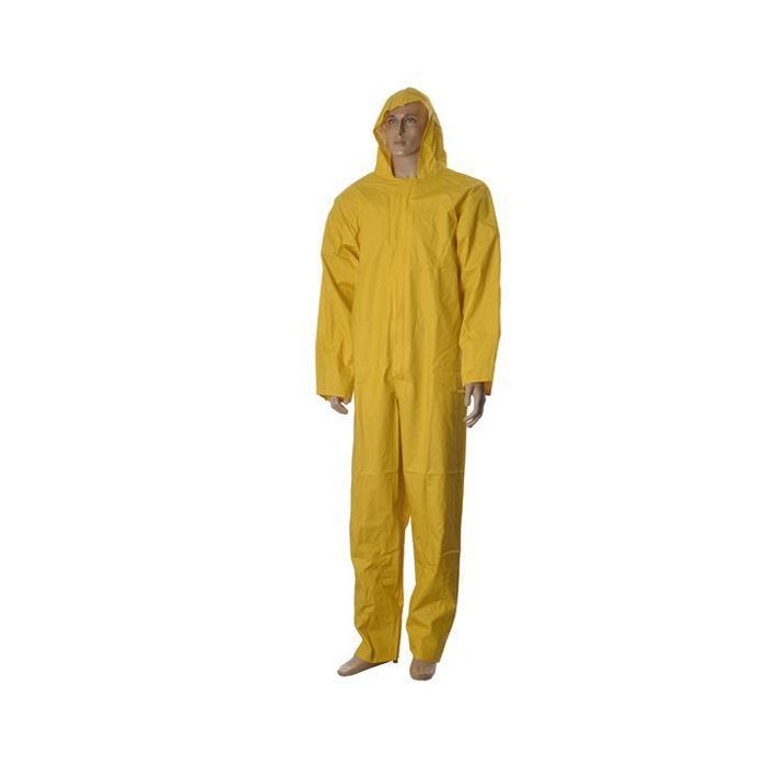 Descrição Macacão de segurança confeccionado em PVC com forro de poliéster, manga longa, capuz, costura através de solda eletrônica, fechamento frontal com zíper e velcro. Especificação Técnica CA: 40534 Cor: Amarelo Gramatura: 32 mm